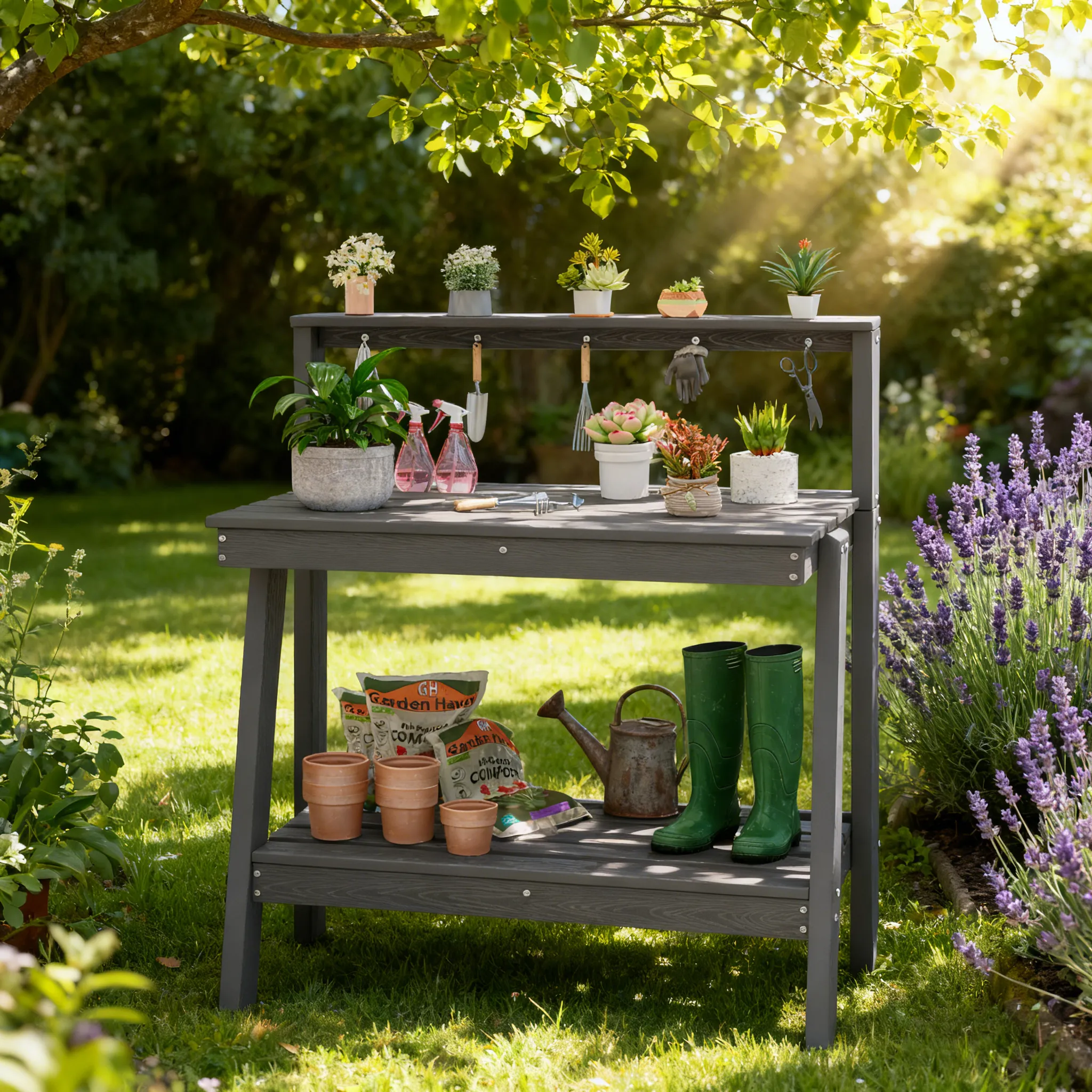 Garden Potting Bench Table with Shelves an Tool Hooks