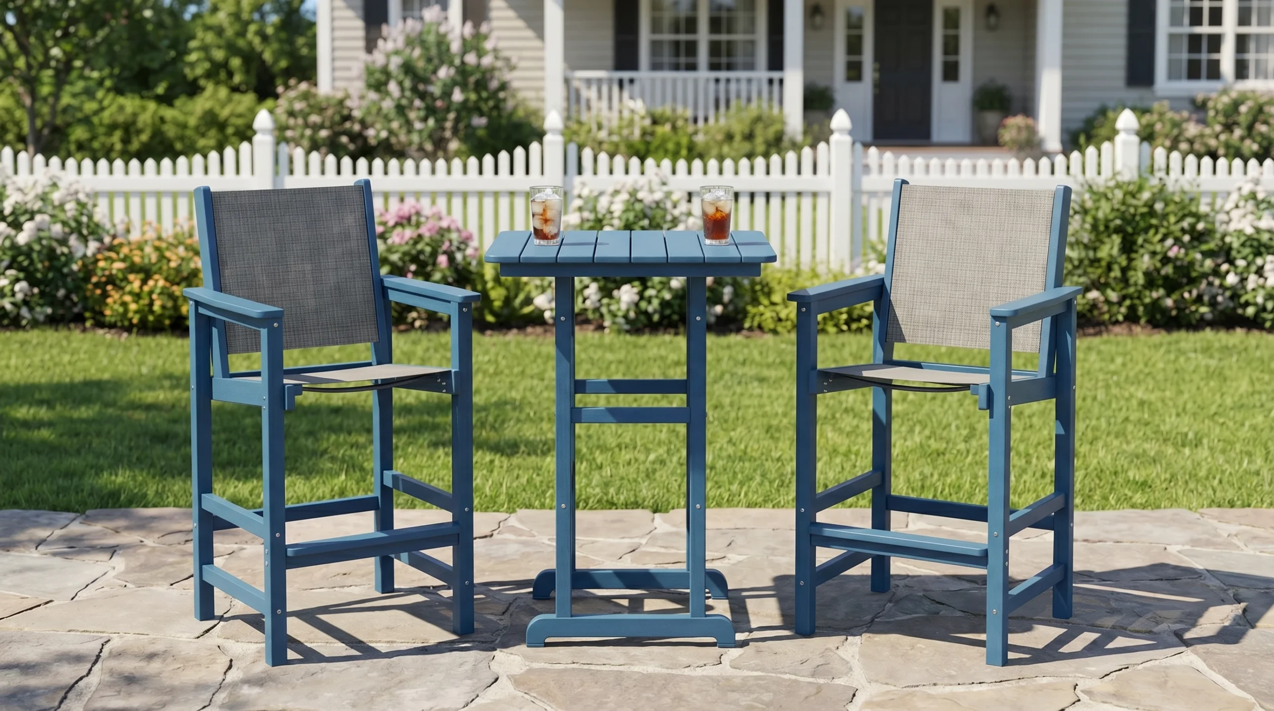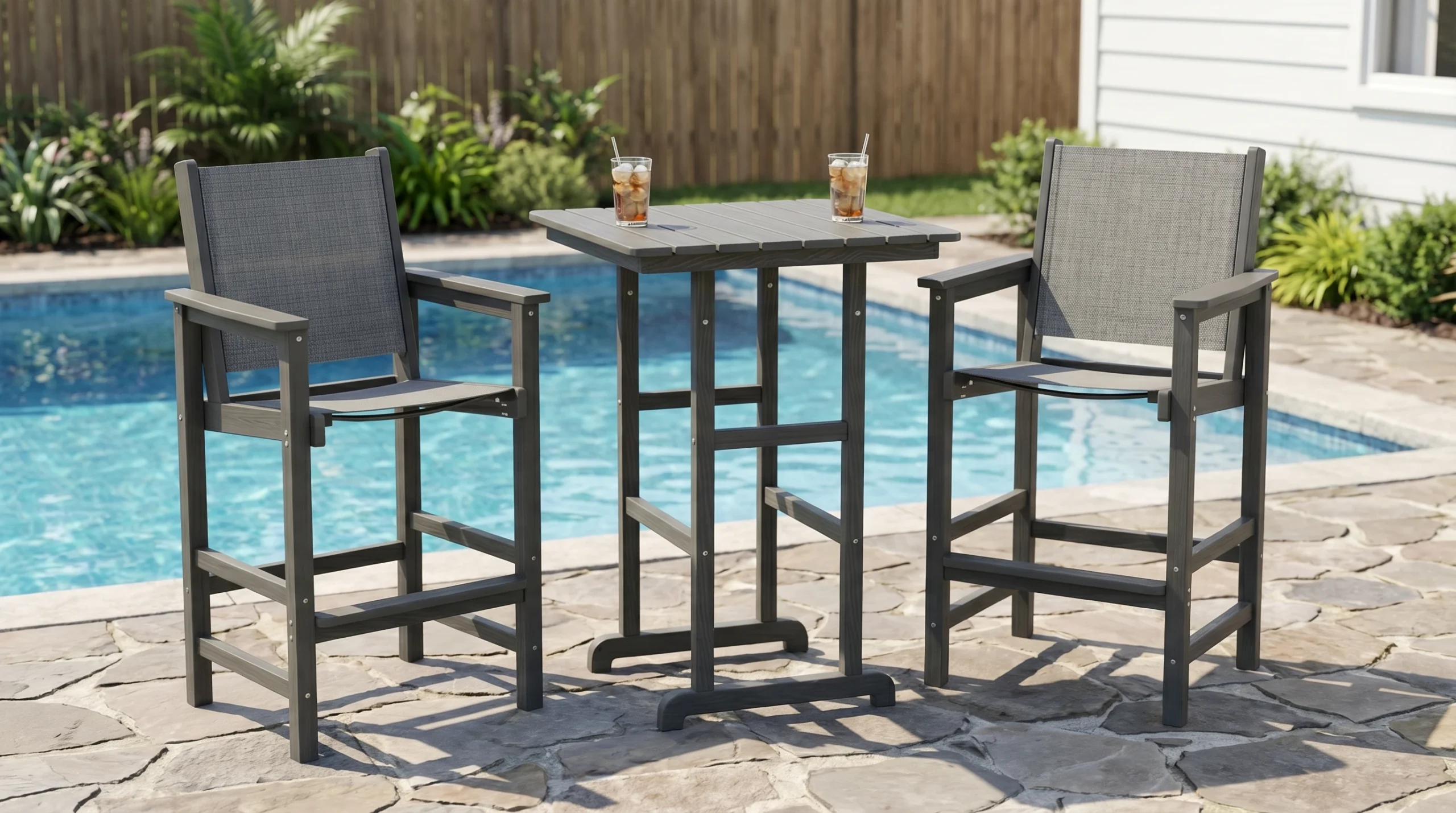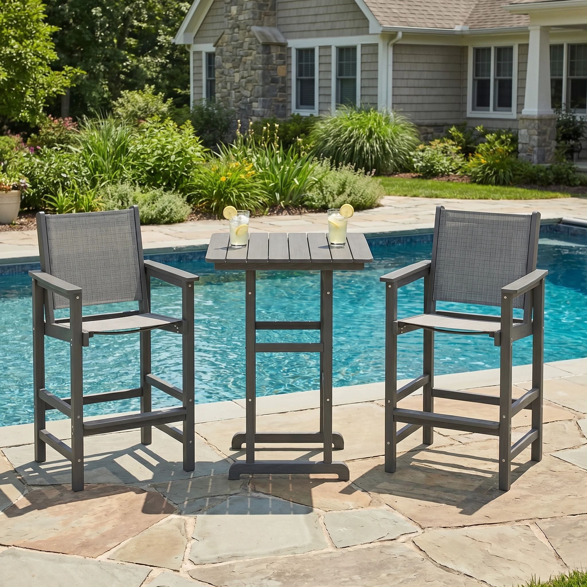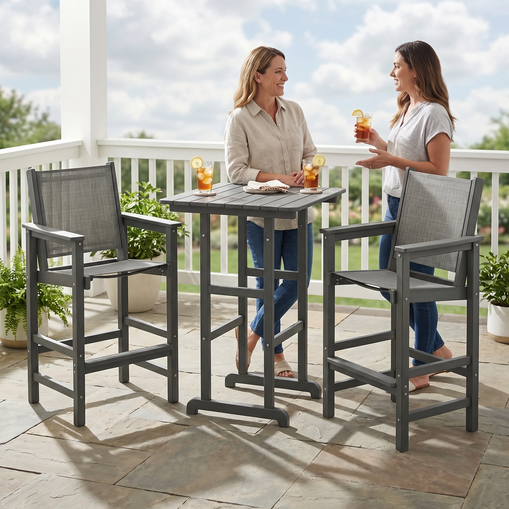 - Bar-Height Entertaining Style: The elevated table and chairs create a casual, social atmosphere that is perfect for drinks, snacks, and conversation.