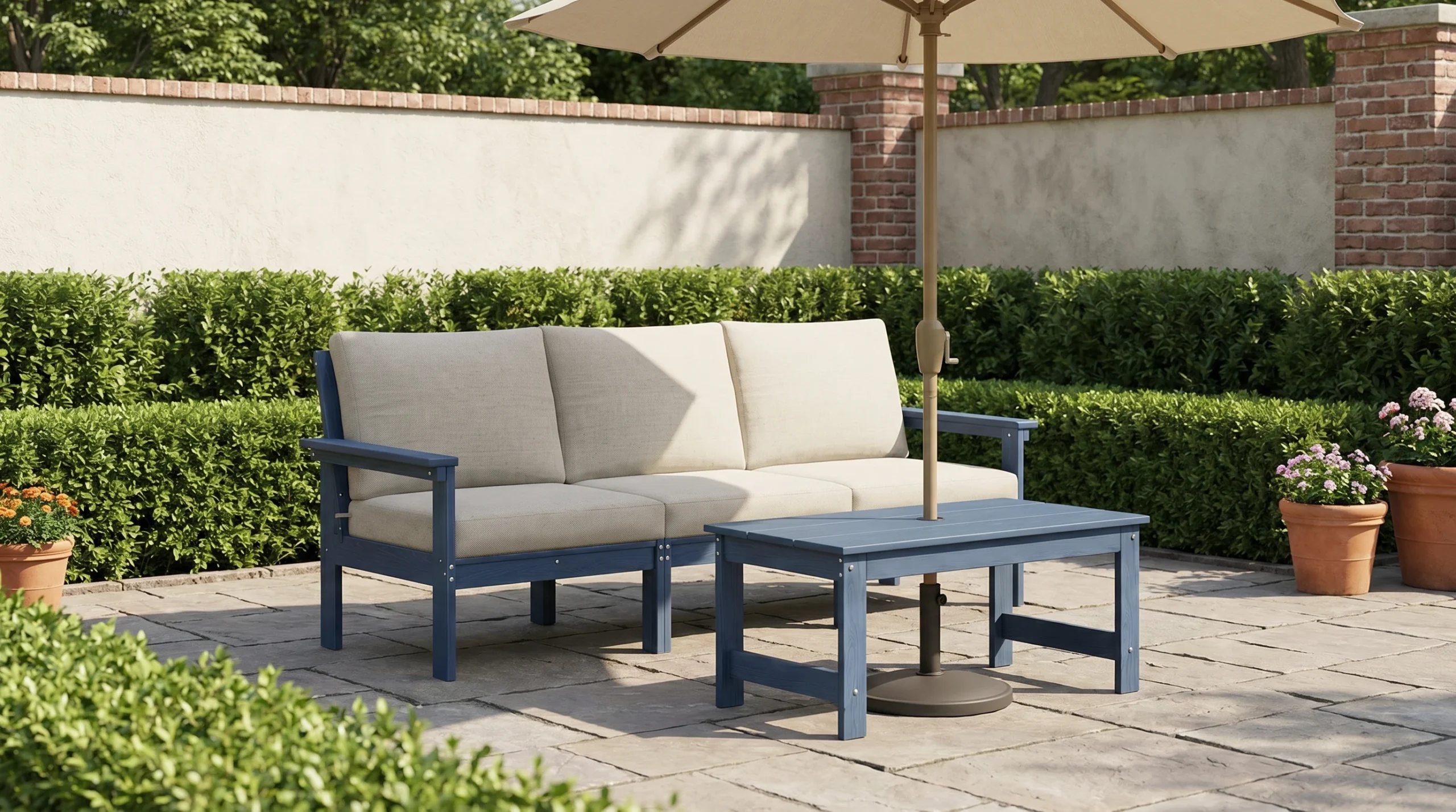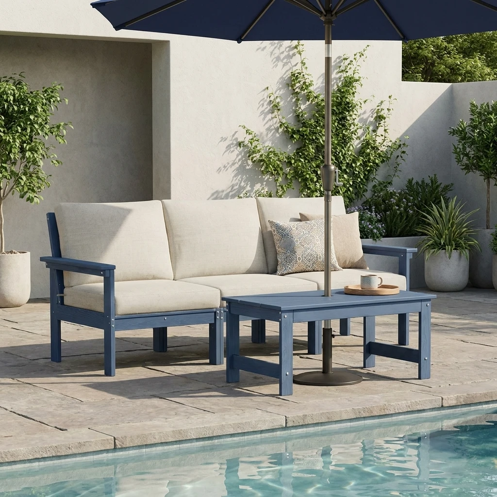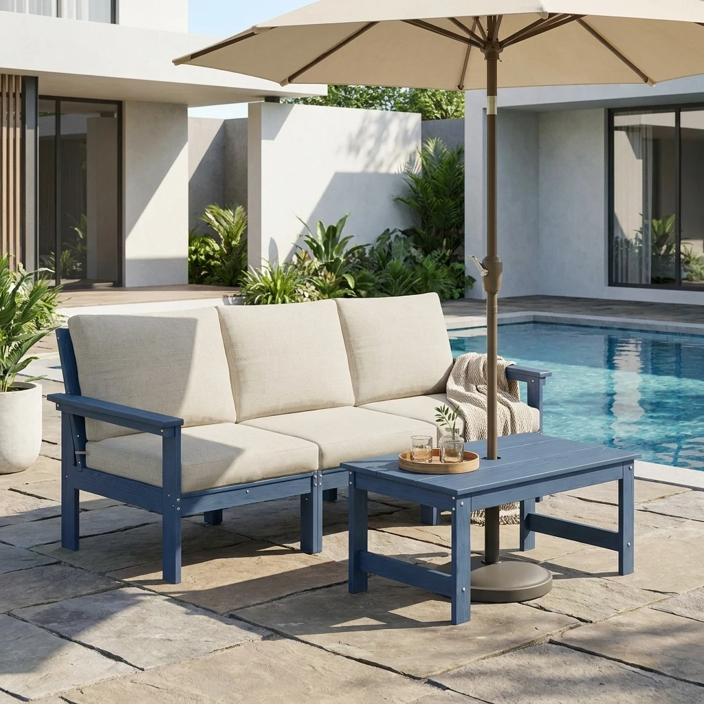 Upgrade your patio with the GRANGE Modern 3-Seater Outdoor Couch with Coffee Table, a stylish set made for everyday comfort and easy entertaining. The spacious sofa features supportive armrests and plush cushions that create a welcoming place to lounge, chat, or unwind outdoors. The matching coffee table keeps drinks, snacks, and décor within reach, while the built-in umbrella hole adds extra convenience for sunny days. Perfect for patios, porches, decks, and backyard spaces, this set brings together comfort, function, and clean modern style in one inviting outdoor setup.