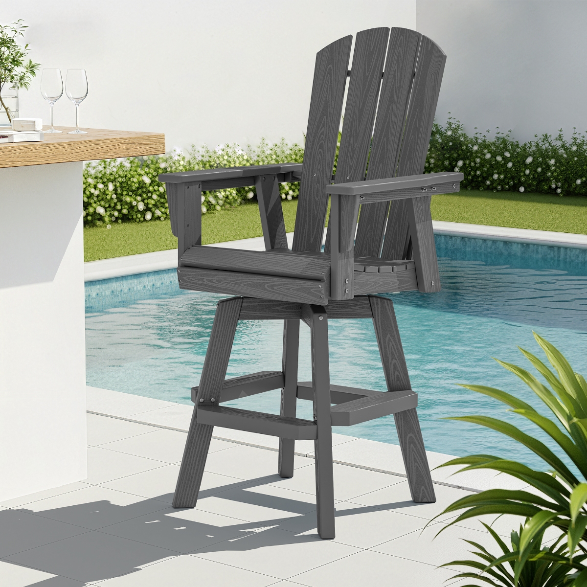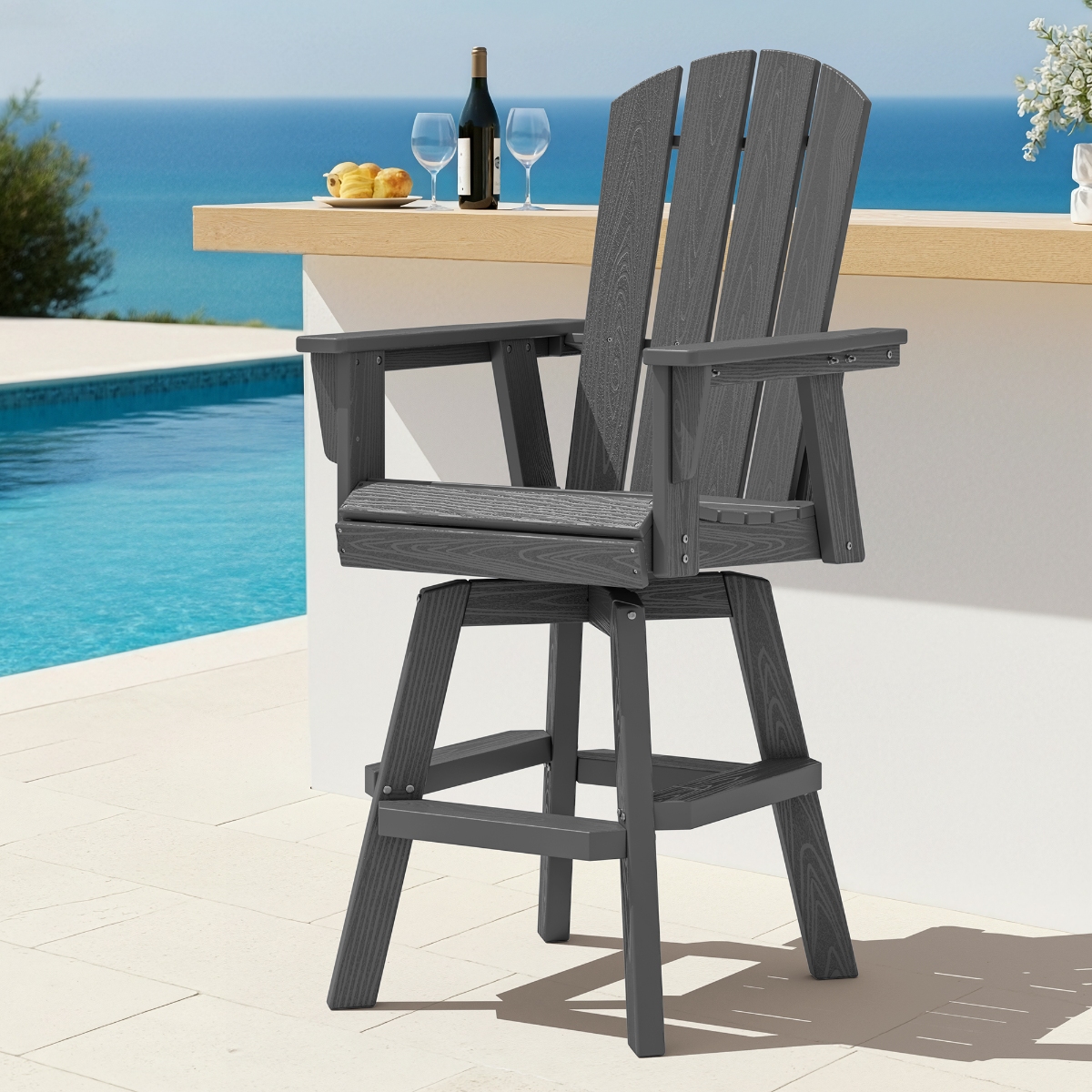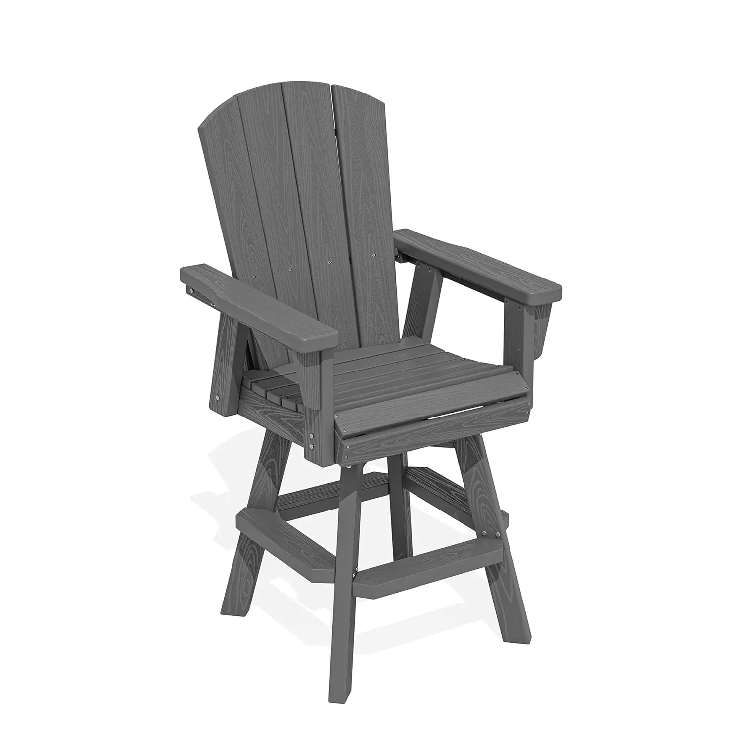 Bring classic Adirondack comfort up to bar height with this outdoor swivel armchair. The contoured slat back, wide seat and armrests support relaxed sitting while the smooth 360° swivel base keeps conversations and views within easy reach. Crafted from durable, weather-resistant HDPE poly lumber that won’t crack, peel, or splinter, it stands strong against sun, rain and salty air. Easy to clean and low maintenance, this bar-height chair pairs perfectly with outdoor bars and counters on the patio, deck, or balcony for casual dining, cocktails and everyday lounging.