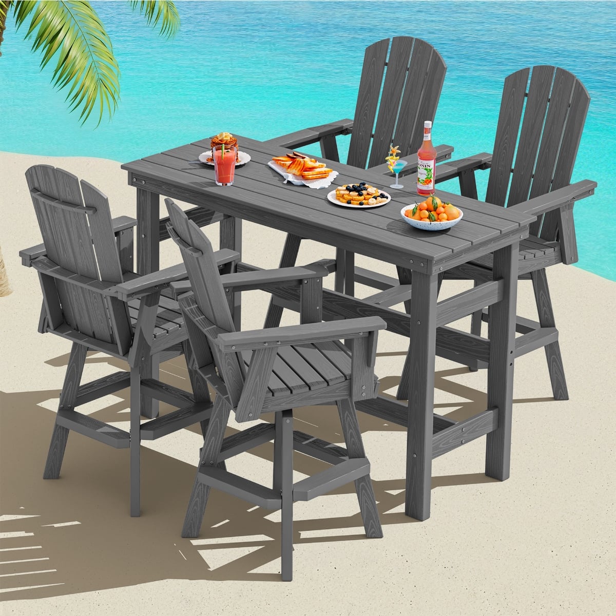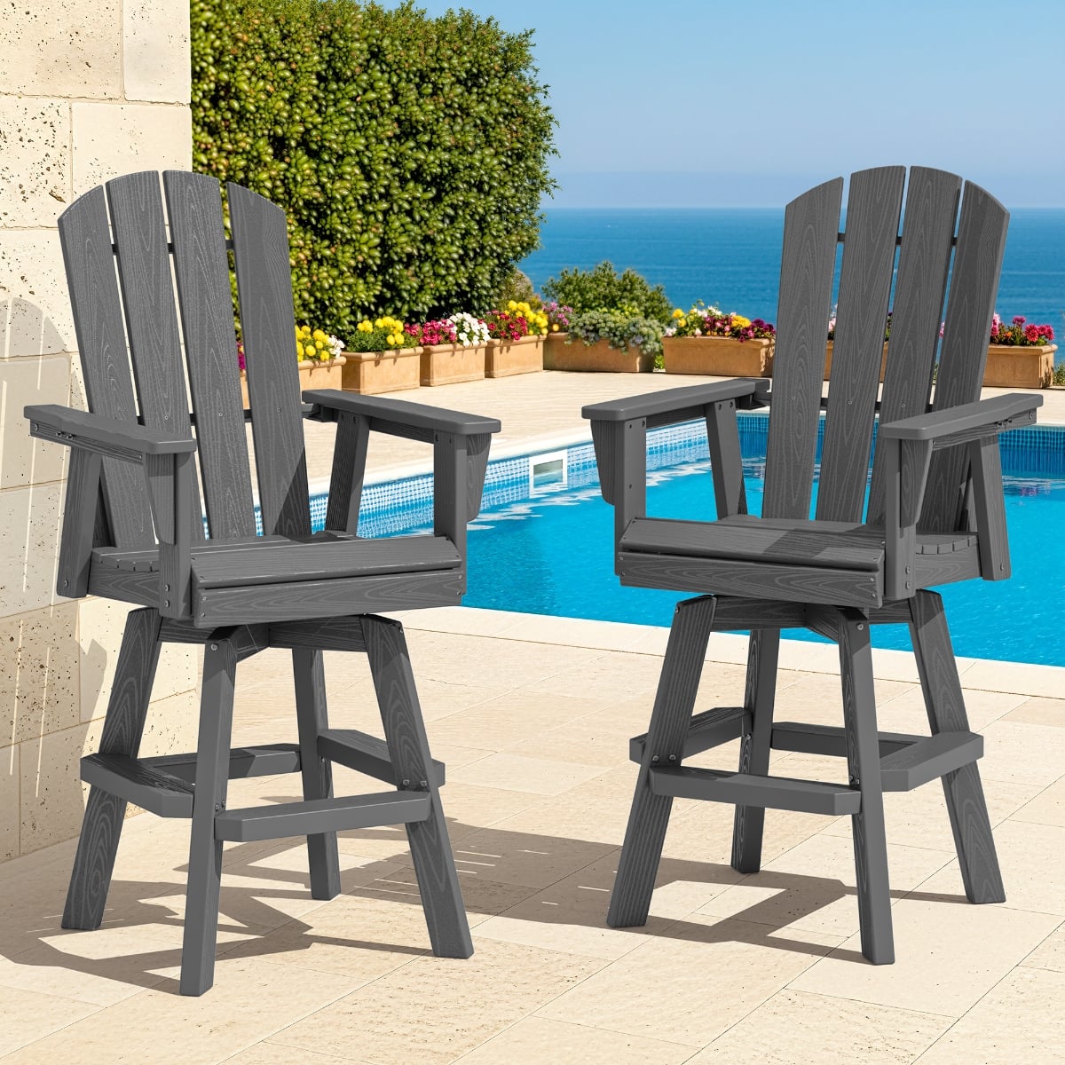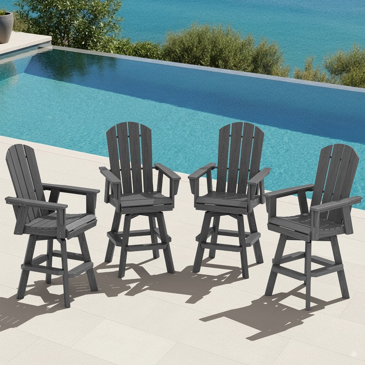 Bring classic Adirondack comfort up to bar height with this outdoor swivel armchair. The contoured slat back, wide seat and armrests support relaxed sitting while the smooth 360° swivel base keeps conversations and views within easy reach. Crafted from durable, weather-resistant HDPE poly lumber that won’t crack, peel, or splinter, it stands strong against sun, rain and salty air. Easy to clean and low maintenance, this bar-height chair pairs perfectly with outdoor bars and counters on the patio, deck, or balcony for casual dining, cocktails and everyday lounging.