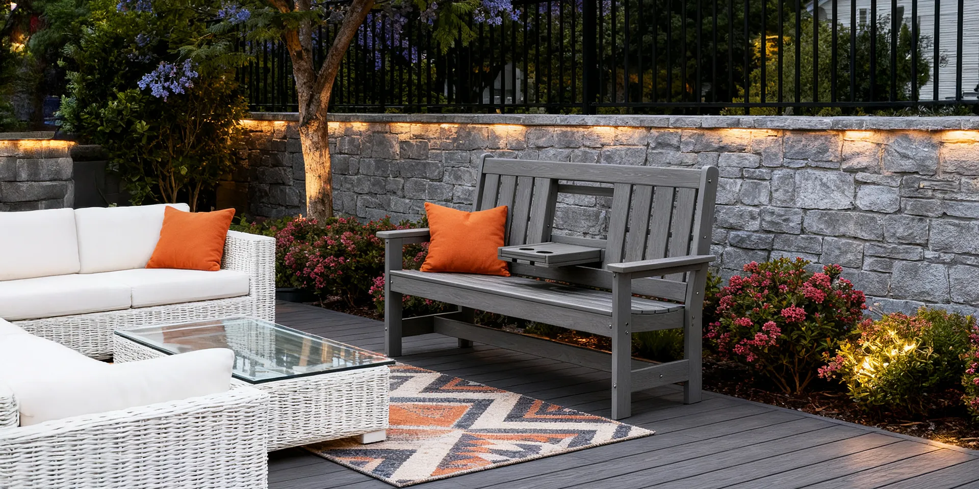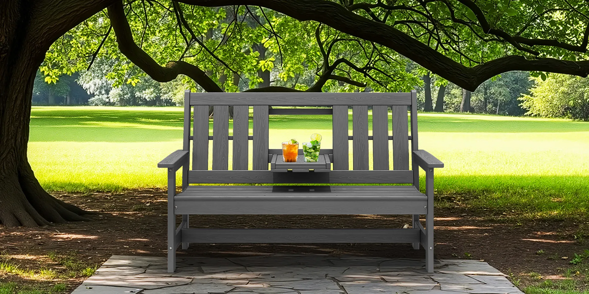 - Flip-Down Table & Cup Holders – Center backrest drops into a sturdy mini table with two cup slots; lift it to convert back to a 3-person bench.