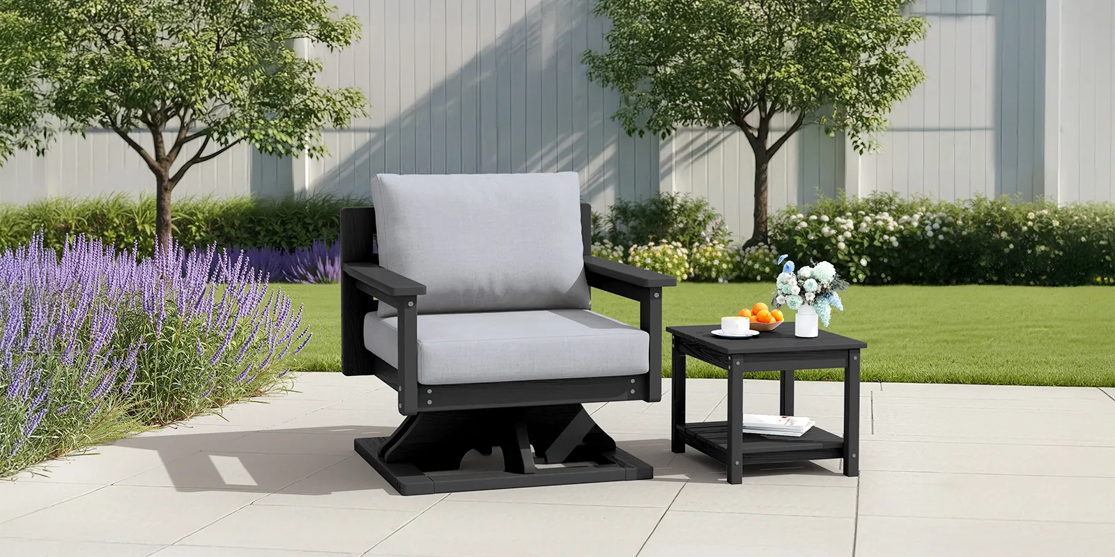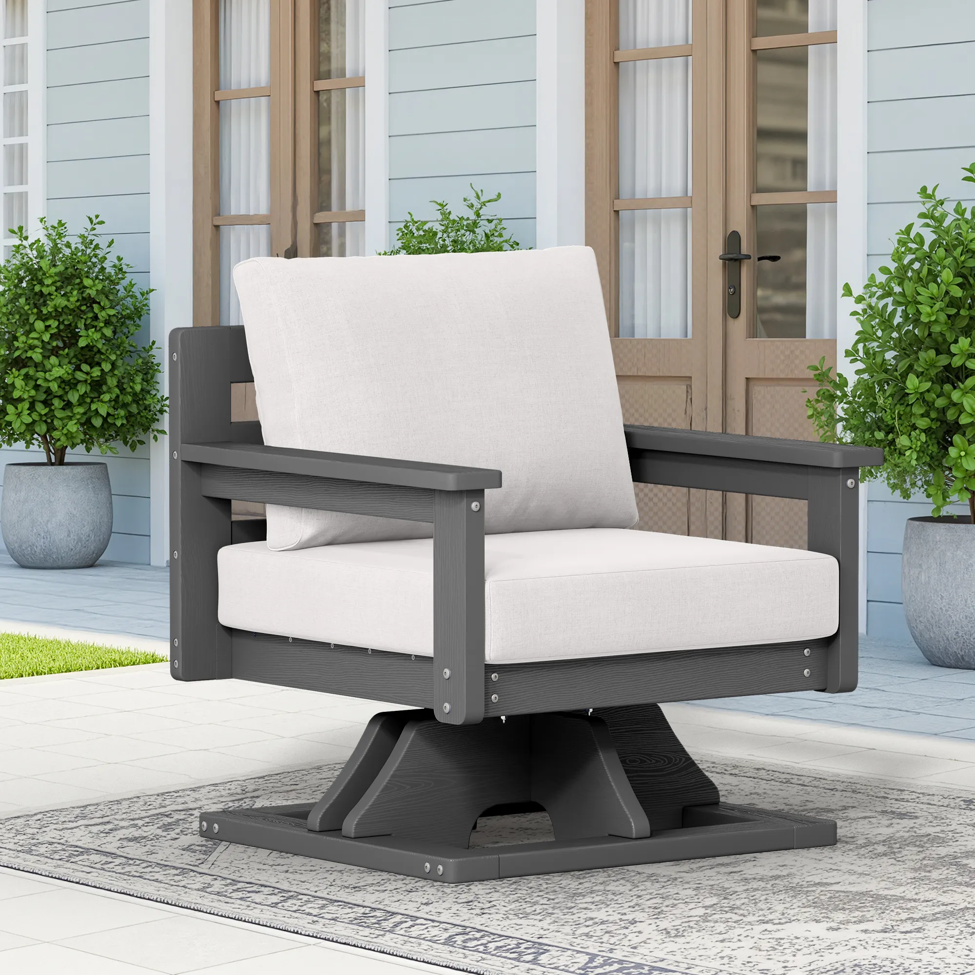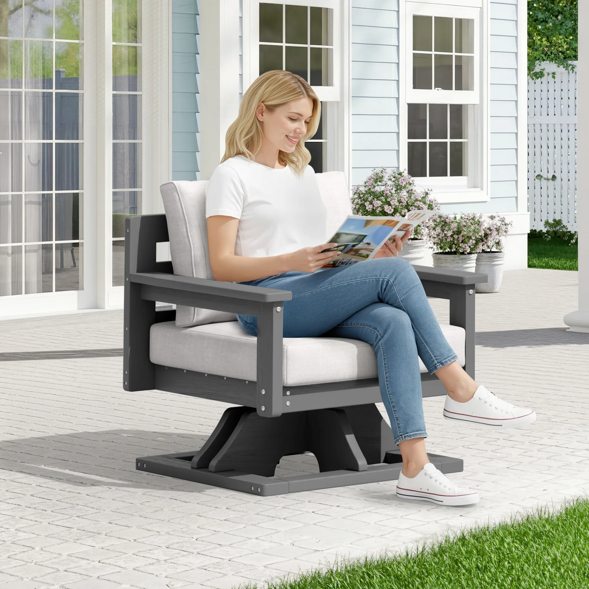 Sink into smooth 360° comfort with this outdoor swivel rocker. The sturdy frame and thickened seat cushion provide ergonomic support, offering lasting comfort and enjoyment. Crafted from weather-resistant HDPE poly lumber, it won’t crack, peel, or splinter and can withstand the test of outdoor weather. The wide armrests and deep seat design allow you to stay relaxed at all times. With its low-maintenance features, it is suitable for various outdoor occasions, such as outdoor cocktail parties and tea parties.
