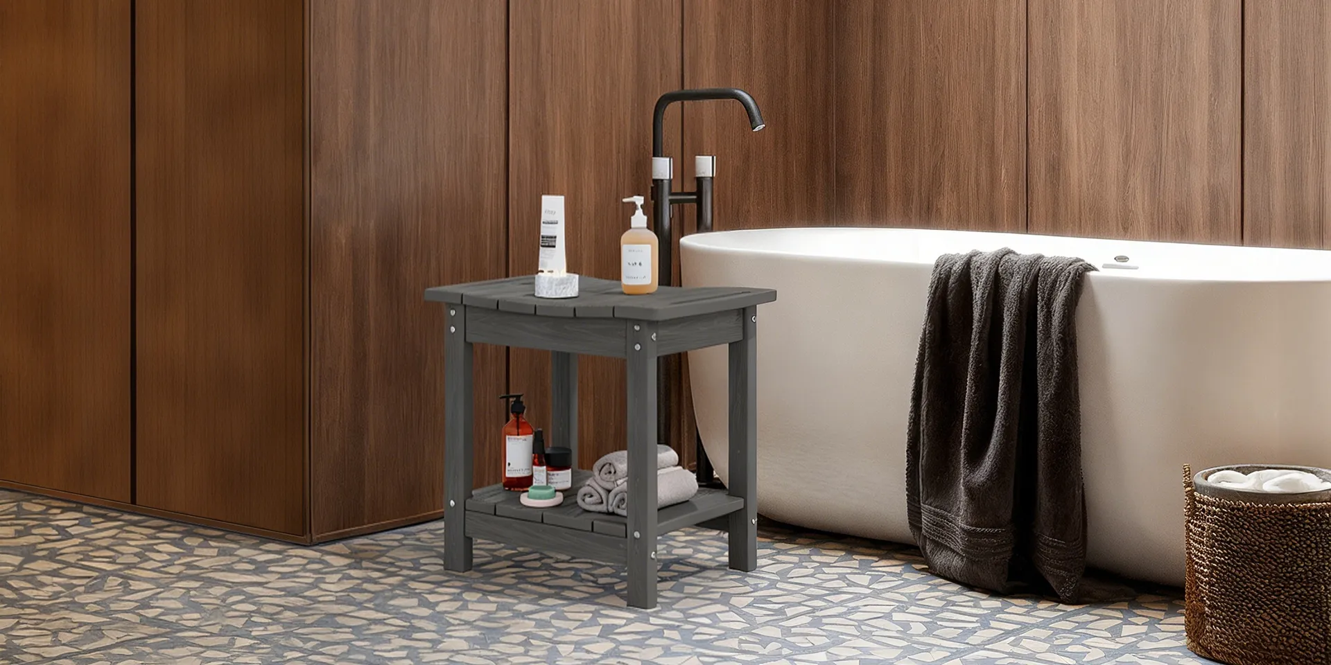 I keep this next to my shower to hold soaps and to sit while drying off. The shelf below is convenient for extra storage, and the dark finish works nicely with my bathroom decor. During assembly, one of the screws needed a bit more tightening to sit flush with the frame. Feels stable enough when I use it daily, and cleaning is super quick with just a wipe-down.