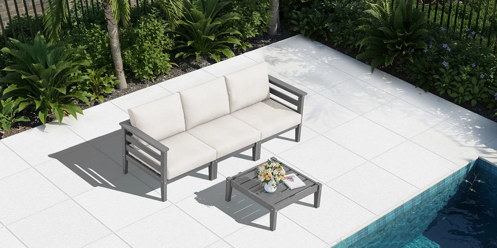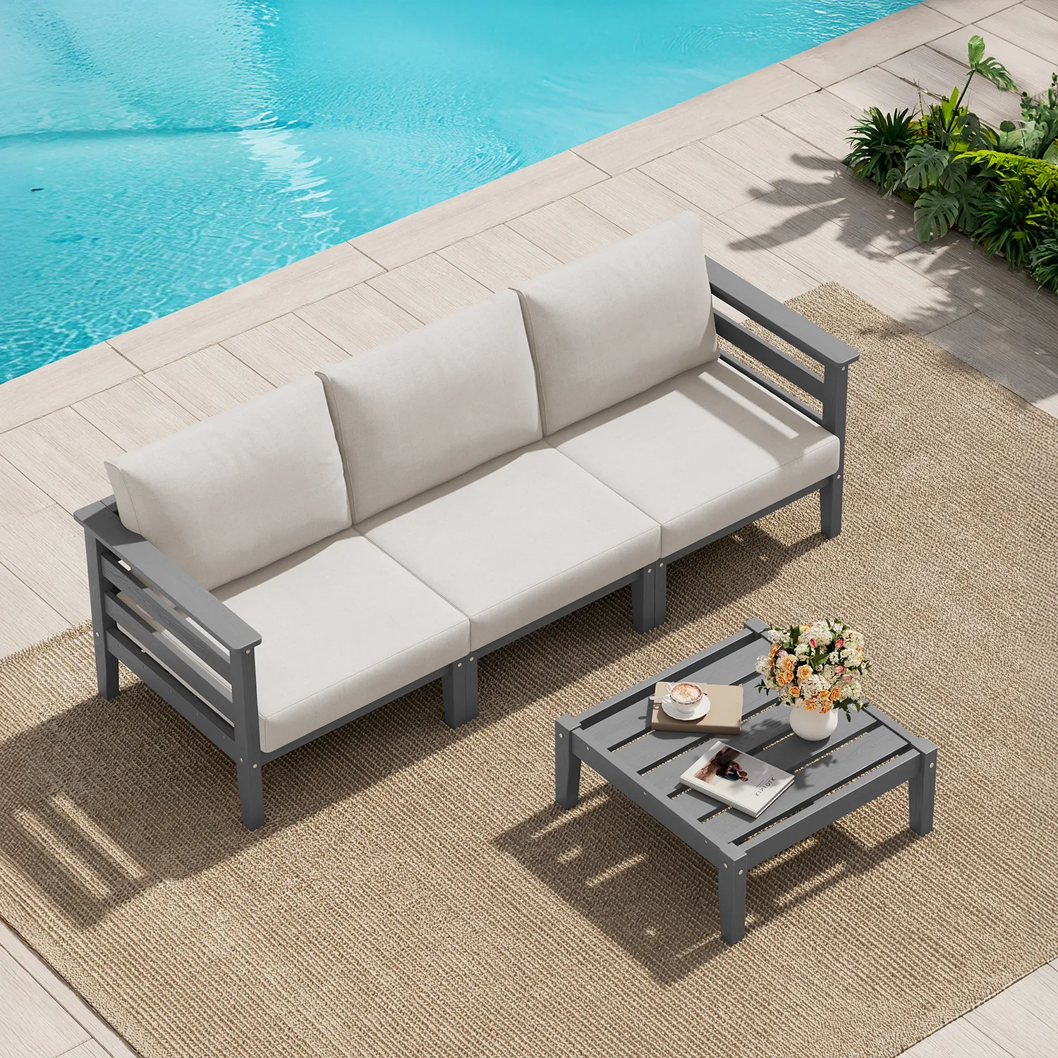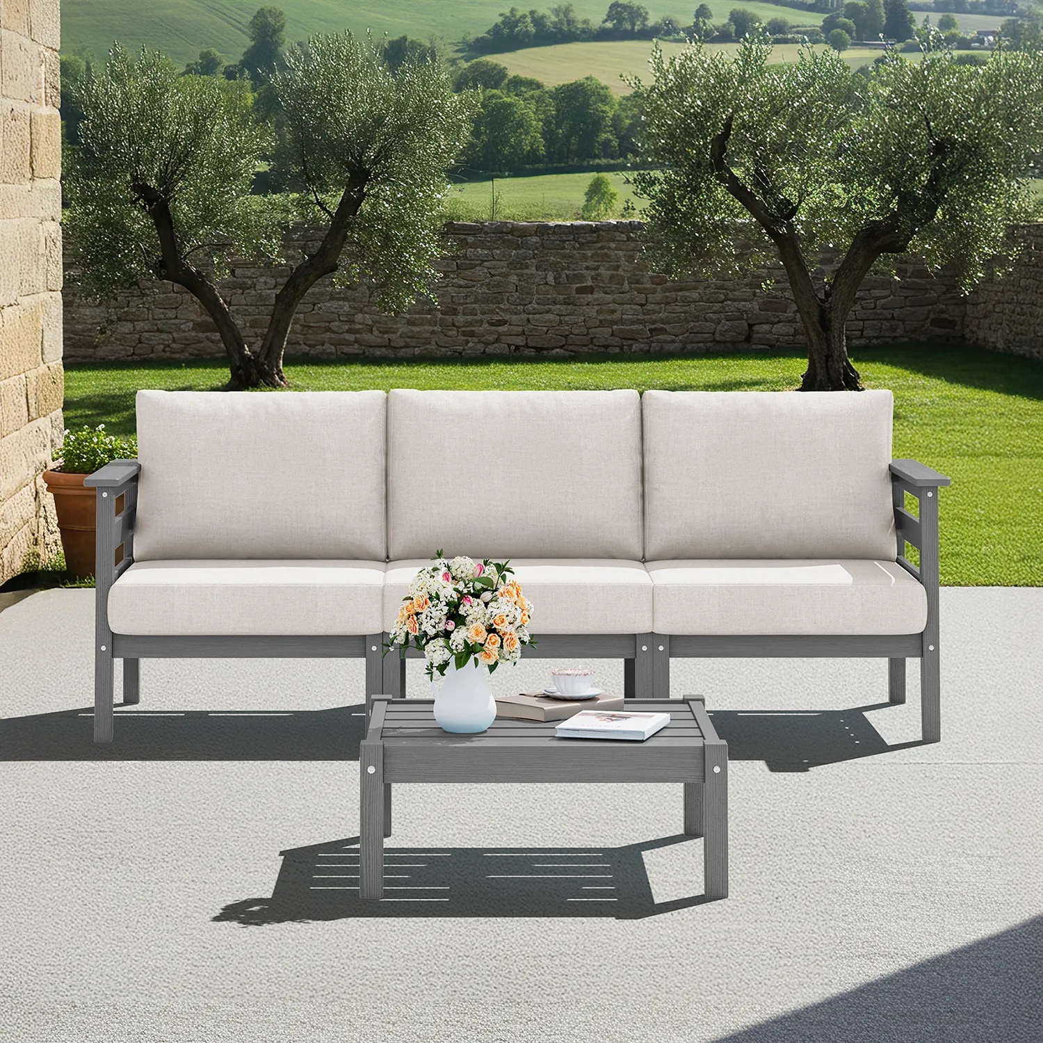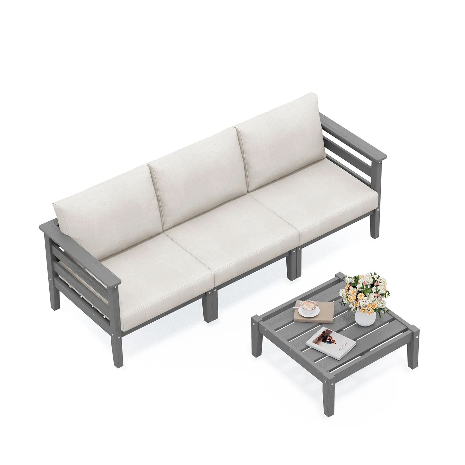 We set this 3-seat sofa set up on our deck for casual gatherings and reading. The grey frame looks modern and sturdy, and the cushions are comfortable enough to sit for a while. During setup, one of the table legs felt a little looser, but tightening the screws fixed it. I like that the simple design makes it easy to clean crumbs or flower petals off the table. Overall, it's held up well outside so far.