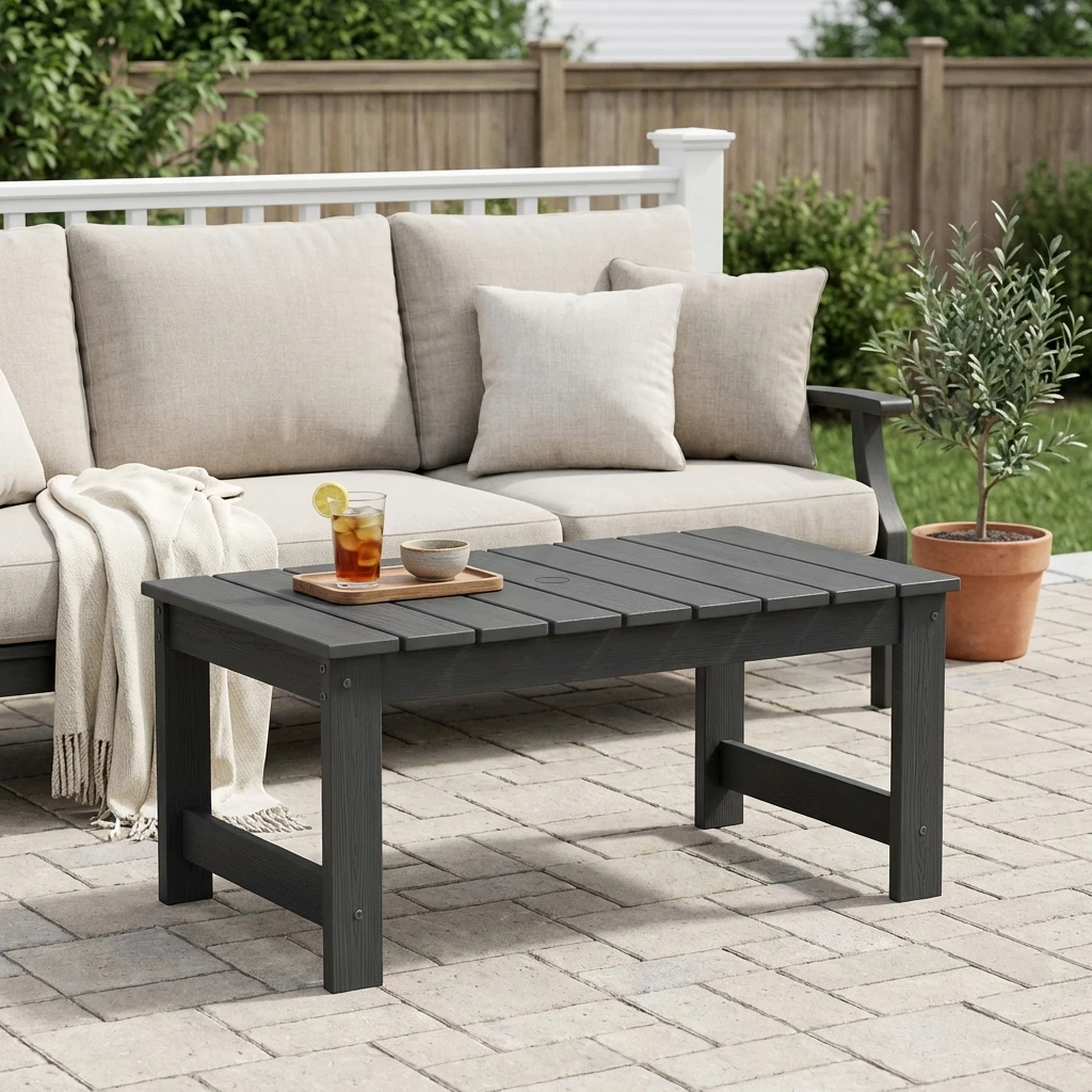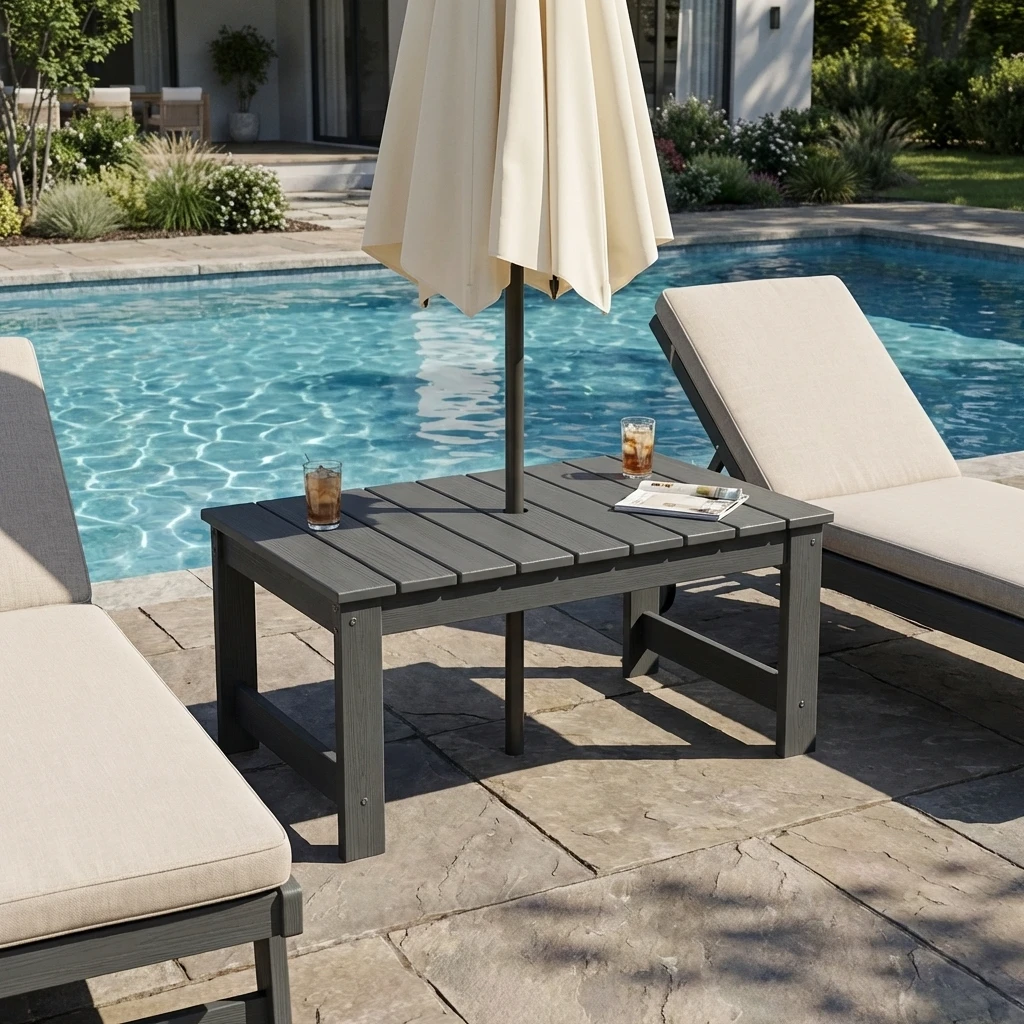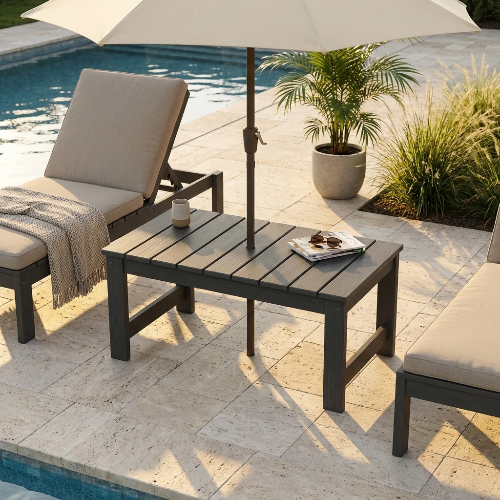 Designed for patios, front porches, or poolside areas, our outdoor coffee table with umbrella holes is the ideal complementary side table. Its simple lines, slatted tabletop, and neutral color scheme allow it to blend perfectly into various decorating styles. The 33.7″(L) x 19.7″(W) x 16.5″(H) tabletop is spacious enough to hold drinks, snacks, decorations, and other outdoor items. The built-in umbrella hole in the center of the tabletop can accommodate various types of patio umbrellas, providing all-day shade. Shop for an outdoor coffee table with umbrella holes to integrate modern aesthetics and practicality into your outdoor space.