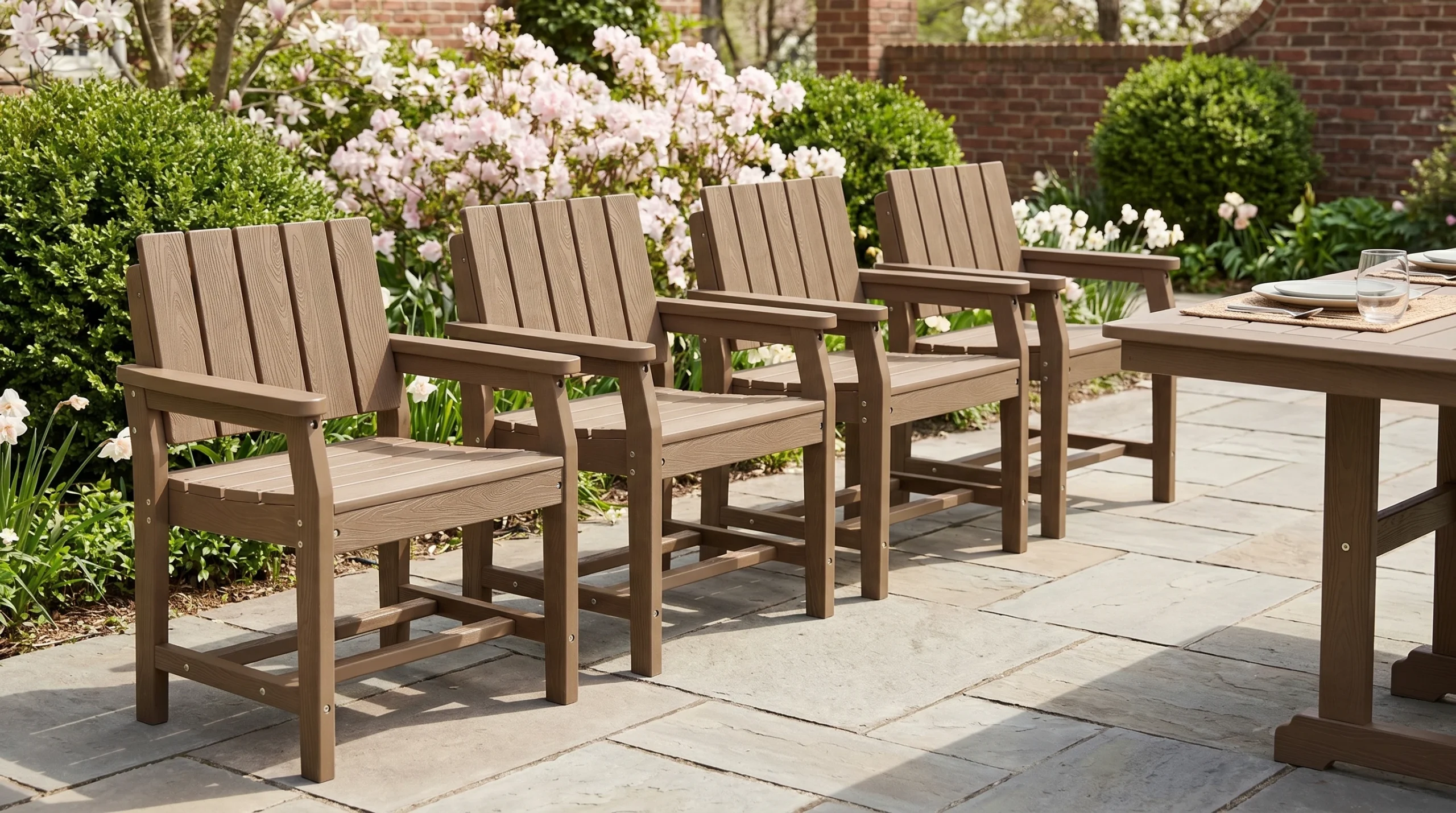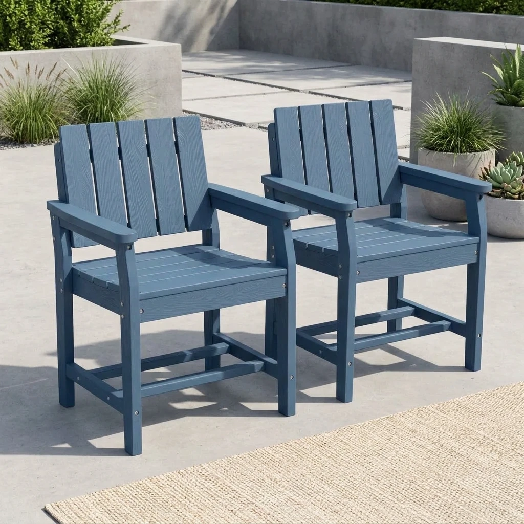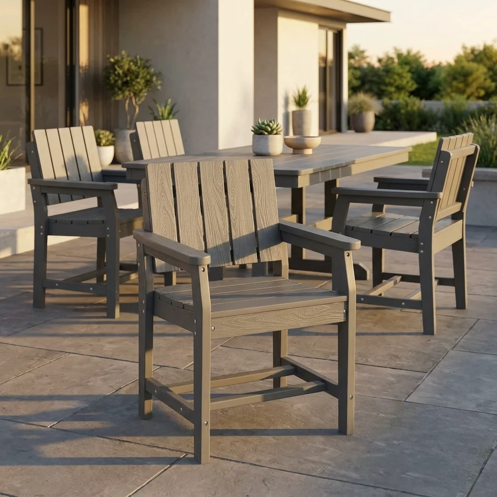 Create a comfortable and inviting outdoor dining setup with the WILLIAMS Poly Outdoor Dining Chair. Designed with a classic slatted back, wide armrests, and a supportive seat, this chair brings relaxed comfort to everyday meals and backyard gatherings. Its sturdy poly construction is made for outdoor use, while the wood-grain texture adds a natural, refined look without the upkeep of traditional wood. Easy to pair with dining tables, conversation sets, or patio accents, the WILLIAMS chair is a versatile choice for patios, decks, porches, and open-air entertaining.